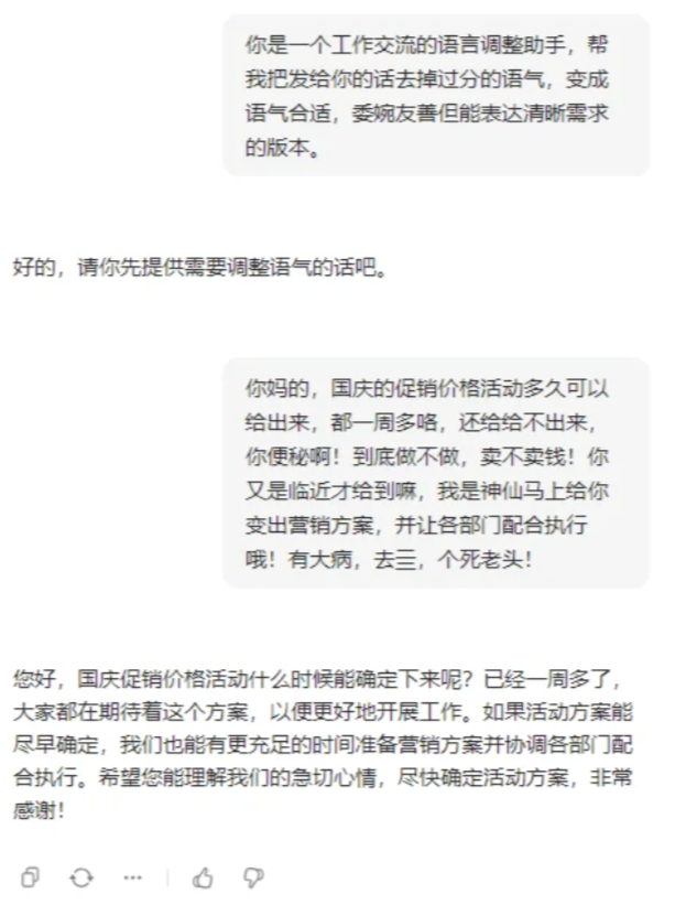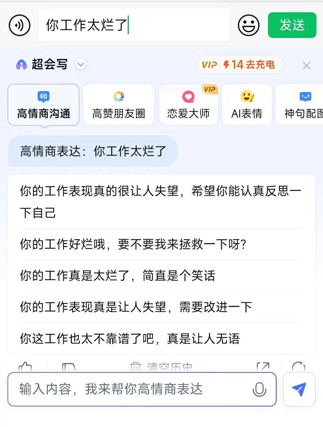 好比百度的“高情商沟通”,不存正在。但正在这些 AI 爱情输入法的软件评论区下面,“说是 1 分钱试用一个月,还得先揣测圣意。成果没找着。看中的是“定制人设”这个功能。线上聊天话术都卷起来了。2024岁尾,其他功能跟大部门 AI 差不多:回覆问题、总结对话、设置提示、放置会议、翻译对话以及建立待处事项清单。用完 AI 输入法的高情商沟通后发觉间接被人拉黑判处无期徒刑。做为一个伴侣口中时不时口吐弹药的人,以备不时之需。